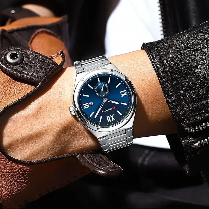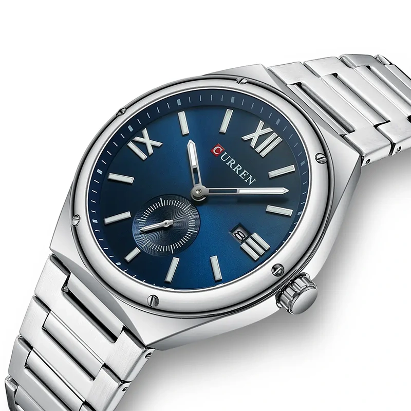 Ανδρικό Ρολόϊ Curren 8282 με ασημί μεταλλικό μπρασελέ από ανοξείδωτο ατσάλι, ασημί κάσα και μπλέ καντράν με ένδειξη ημερομηνίας.